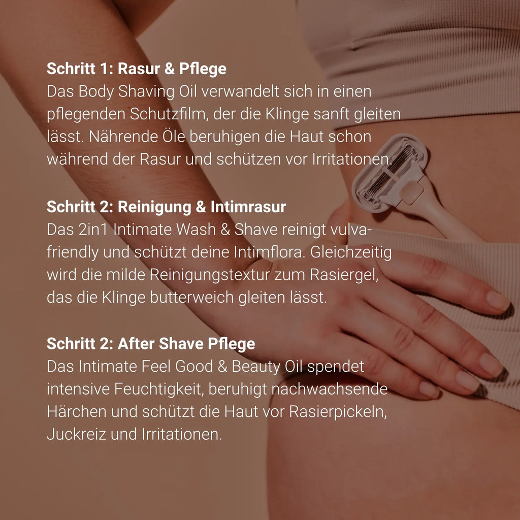 The Body Shaving Oil is slightly lighter than the Feel Good & Beauty Oil and is adapted for wet shaving with our razor. It makes it easier for the razor blades to glide and also cares for the skin as it is slowly absorbed. The Intimate Feel Good & Beauty Oil is very rich and slightly thicker, as it is intended for intensive care of the sensitive intimate area. As an after-shave product, it is adapted to the thin, shaving-stressed skin of the outer intimate area.