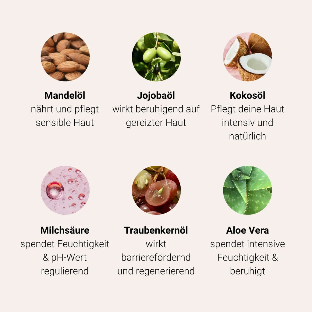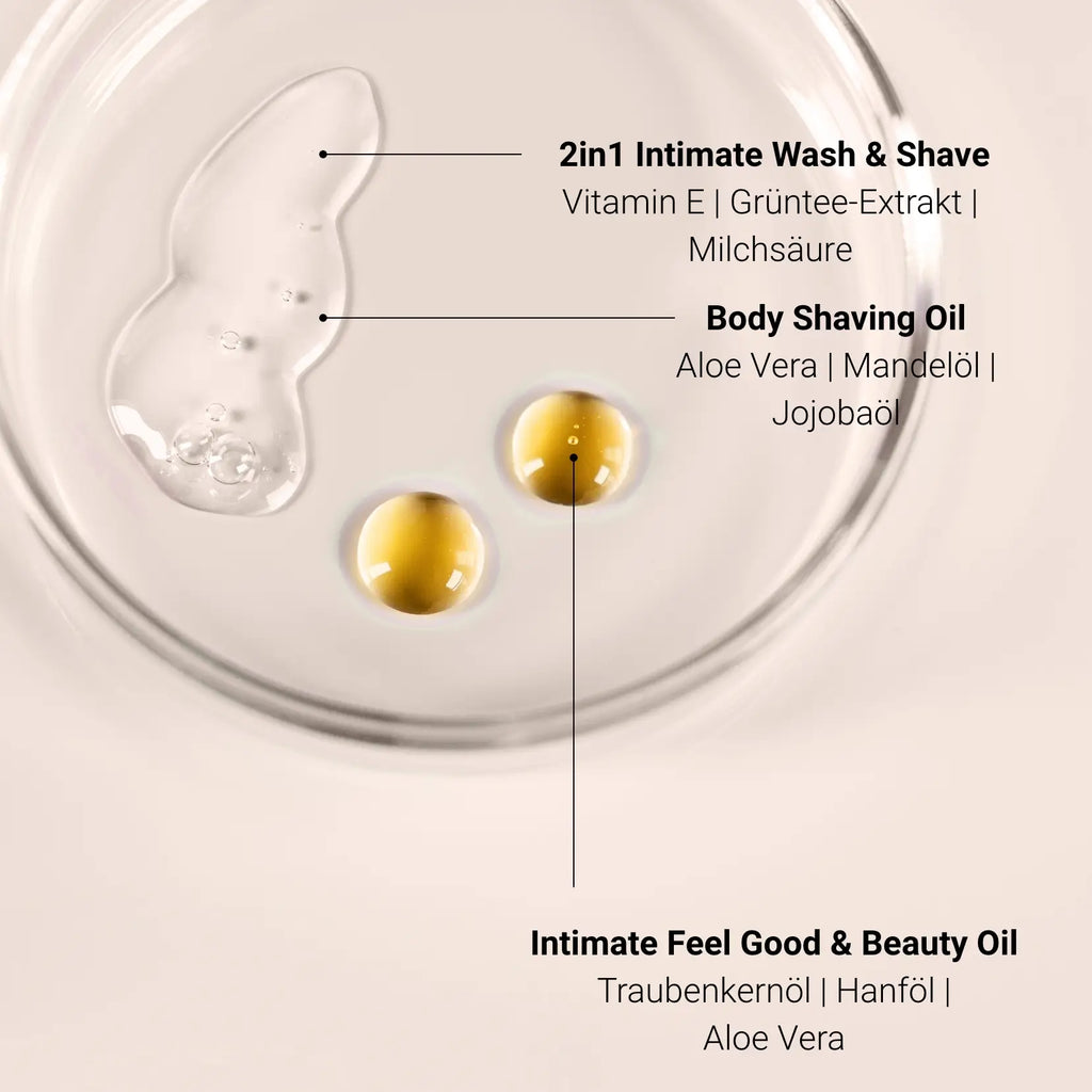 After cleansing and shaving, the unique Intimate Feel Good & Beauty Oil gives you an extra dose of care. The unique formula of 12 natural oils, with hemp oil, aloe vera and almond oil, helps you in all situations. Whether for daily care after cleansing, as an aftershave to prevent razor burn and ingrown hairs, or to combat feelings of dryness - enjoy silky-soft skin all over your body and a healthy glow!