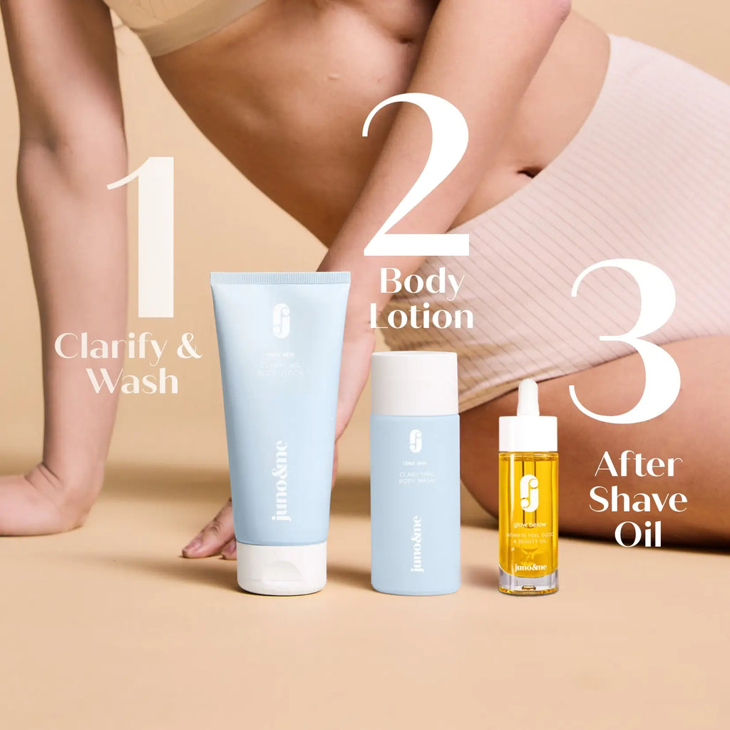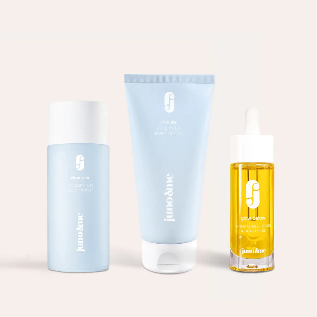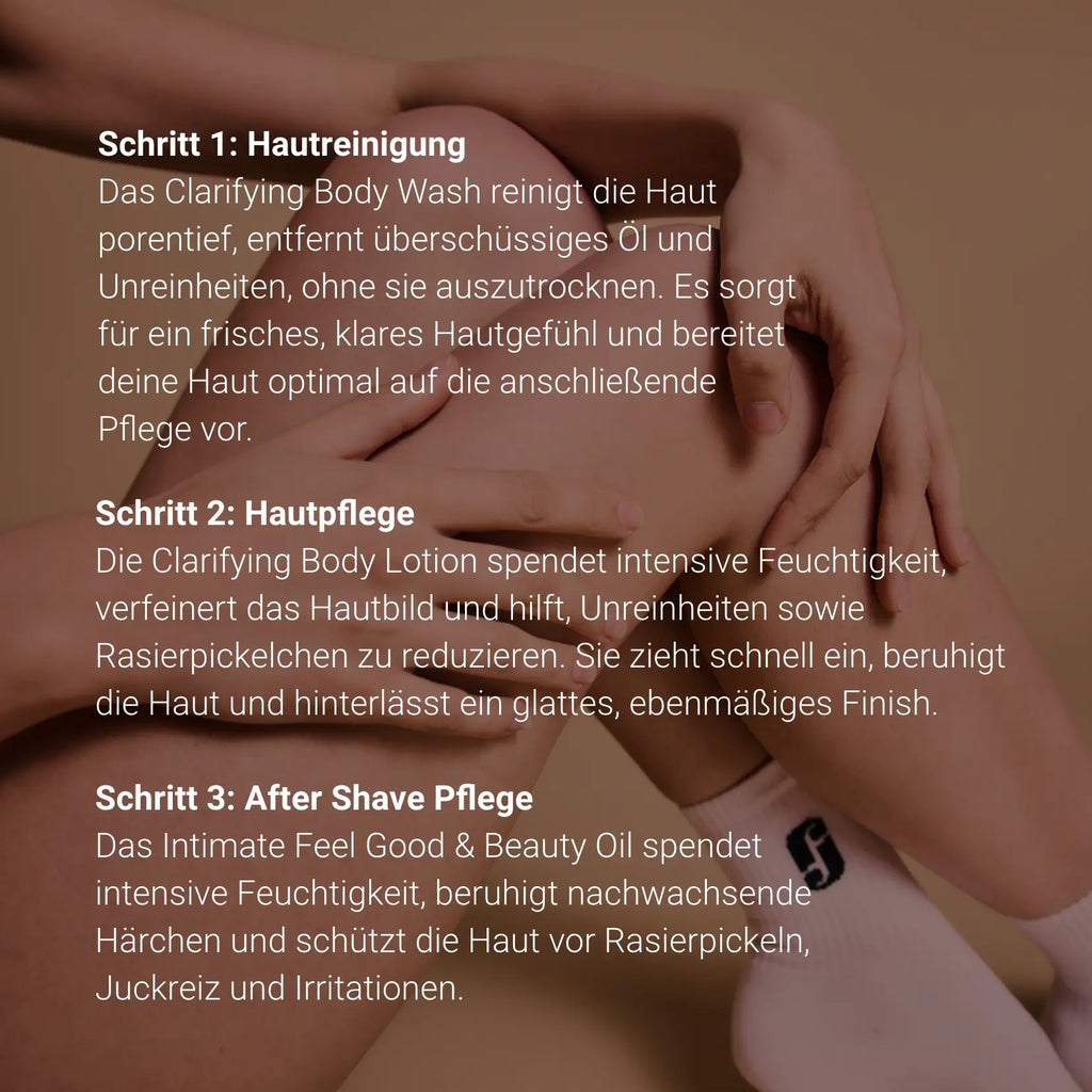 Die Clarifying Body Lotion beugt Unreinheiten langfristig vor. BHA klärt die Poren, der AHA-Komplex glättet die Hautstruktur und Wirkstoffe wie Manukaöl sowie Pfeffer- und Magnolienextrakt wirken antibakteriell und talgregulierend. Gleichzeitig pflegt und beruhigt die Lotion die Haut.Das glow below® Intimate Feel Good & Beauty Oil spendet intensive Feuchtigkeit und ist besonders gut verträglich für den äußeren Intimbereich – auch in Nähe der Vaginalschleimhaut.