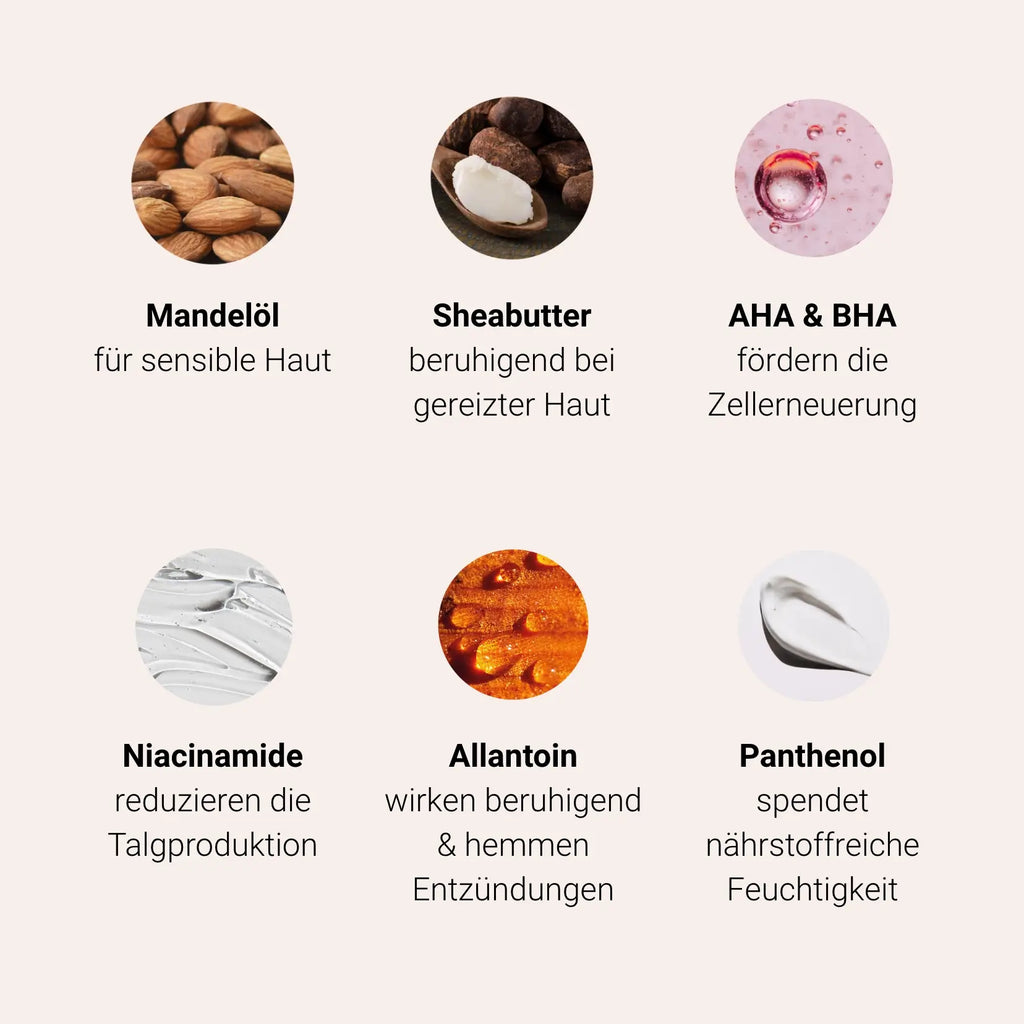Der Clarifying Body Wash reinigt porentief, entfernt abgestorbene Hautzellen und unterstützt die Hauterneuerung. AHA (Glykolsäure) und BHA (Salicylsäure) befreien die Poren, während Zink, Niacinamid und Allantoin die Talgproduktion regulieren und antibakteriell wirken – für ein frisches, glattes Hautgefühl.